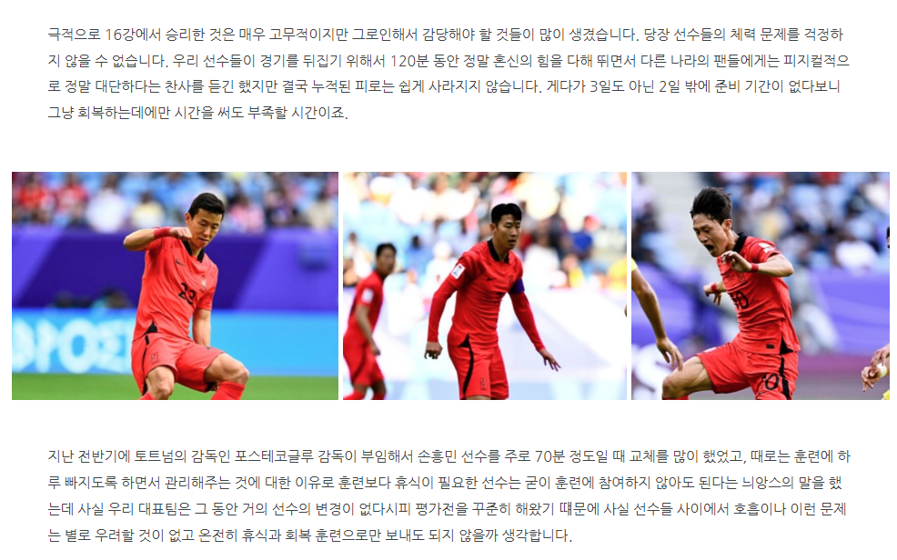 바꿔 말해 이번 8강전에서는 선수단 풀가동이 가능합니다. 물론 경고 누적은 이 경기까지 유효하므로 이번 경기에서 경고를 두 장째 받는 선수가 나오면 그 선수는 준결승전 출전이 불가능해지만, 준결승 상대가 타지키스탄 or 요르단으로 정해지며 8강전이 사실상 최대의 고비가 된 만큼 지금 당장 모든 전력을 쏟아부을 수 있는 것은 정말 좋은 소식입니다.